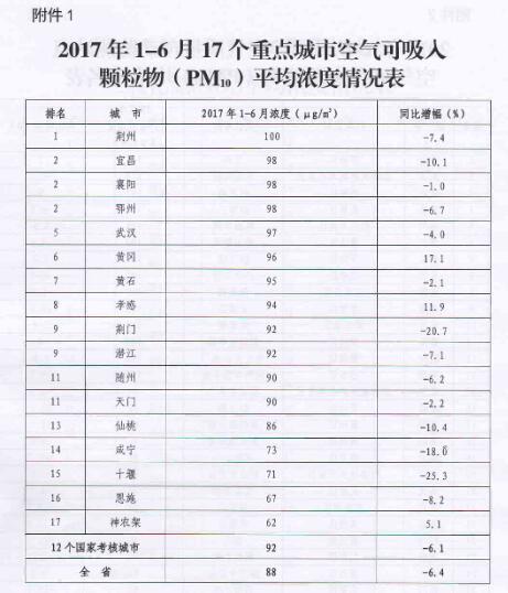橙电网环保网获悉,湖北省环保厅通报了全省2017年1-6月份环境空气质量相关情况,具体内容如下:各市、州、直管市、神农架林区人民政府:为贯彻落实《国务院关于印发大气污染防治行动计划的通知》(国发〔2013〕37号)精神,按照《国务院办公厅关于印发大气污染防治行动计划实施情况考核办法(试行)的通知》(国办发〔2014〕21号)及《关于印发<大气污染防治行动计划实施情况考核办法(试行)实施细则>的通知》(环发〔2014〕107号)要求,现将全省2017年1-6月份环境空气质量(未剔除沙尘天气影响)