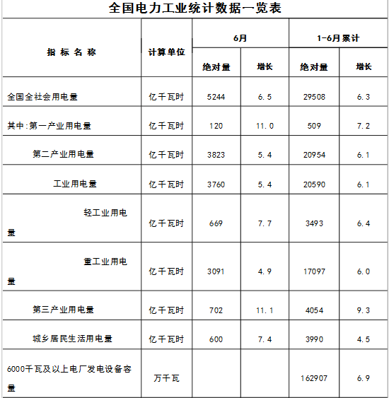 橙电网售电网在国家能源局官网获悉,1-6月份全国电力工业统计数据发布,1-6月全国全社会用电量29508亿千瓦时,同比增长6.3%。全国售电量23595亿千瓦时,同比增长6.9%