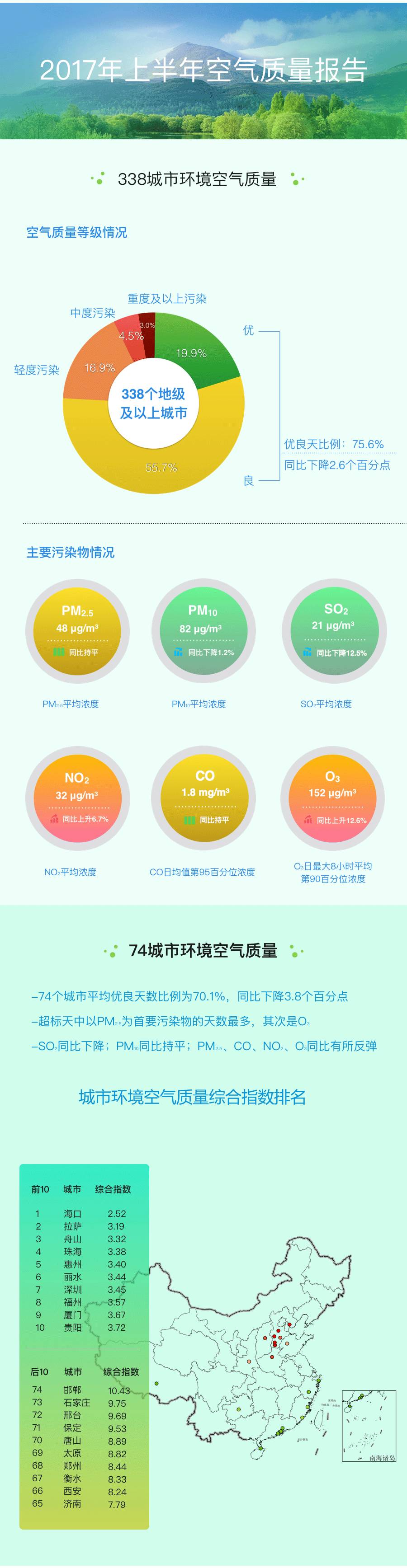 近日,环境保护部发布2017年上半年全国和京津冀、长三角、珠三角区域及直辖市、省会城市、计划单列市空气质量状况。具体环境监测数据如下:延伸阅读:图说|八大方面!2017年全国生态环境监测工作要点全在这儿