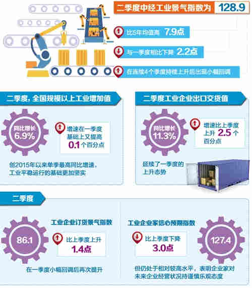 由经济日报社中国经济趋势研究院、国家统计局中国经济景气监测中心、中国社科院数量经济与技术经济研究所共同编制的2017年二季度中经产业景气指数今日发布。与一季度相同,所采集具有代表性的行业或领域共14个,既包括煤炭、石油、电力、钢铁、有色金属、非金属矿物制品、化工、汽车制造、IT设备制造、医药、服装等具体行业,又涵盖能源、材料和工业等综合性领域