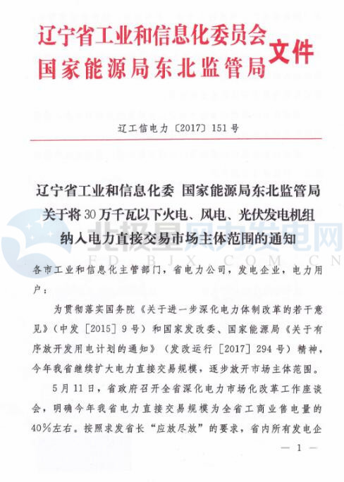 橙电网风力发电网获悉,辽宁省工信委、东北能监办近日联合发布《关于将30万千瓦以下火电、风电、光伏发电机组纳入电力直接交易市场主体范围的通知》,30万千瓦以下火电、风电、光伏发电机组参与市场交易相关规则将另行通知。以下为通知原文: