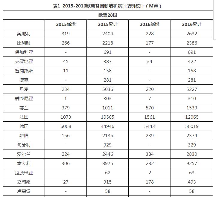 风电装机占到了欧洲2016年新增电力装机的51%;♦ 可再生能源电力装机占到了欧洲2016年新增电力装机的86%;♦ 截止2016年底欧盟风电累计装机达到153.7GW,取代煤电成为第二大电源;♦ 2016年欧洲的风电发电量为300TWh,占到欧洲全年用电量的10.4%;♦ 2016年欧洲用于风电发展上的投资为275亿欧元,同比2015年增加5%。♦ 2016年欧洲新增海上风电并网装机1558MW,新增并网338台机组;♦