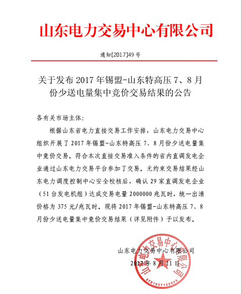 本网从山东电力交易中心获悉,山东电力交易中心日前发布了关于2017年锡盟-山东特高压7、8月份少送电量集中竞价交易结果的公告,统一出清价格为375元/兆瓦时。具体公告如下