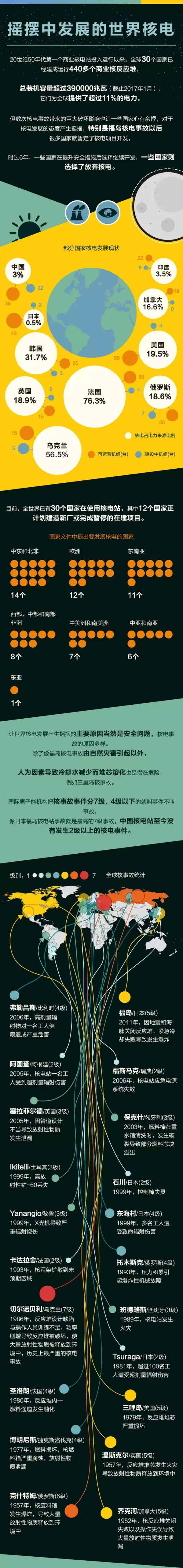 20世纪50年代第一个商业核电站投入运行以来,全球30个国家已经建成运行440多个商业核反应堆,总装机容量超过390000兆瓦(截止2017年1月),它们为全球提供了超过11%的电力。但数次核电事故带来的巨大破坏影响也让一些国家心有余悸,对于核电发展的态度产生摇摆,特别是福岛核电事故以后,很多国家就暂定了核电项目开发,时过6年,一些国家在提升安全措施后选择继续开发,一些国家则选择了放弃核电