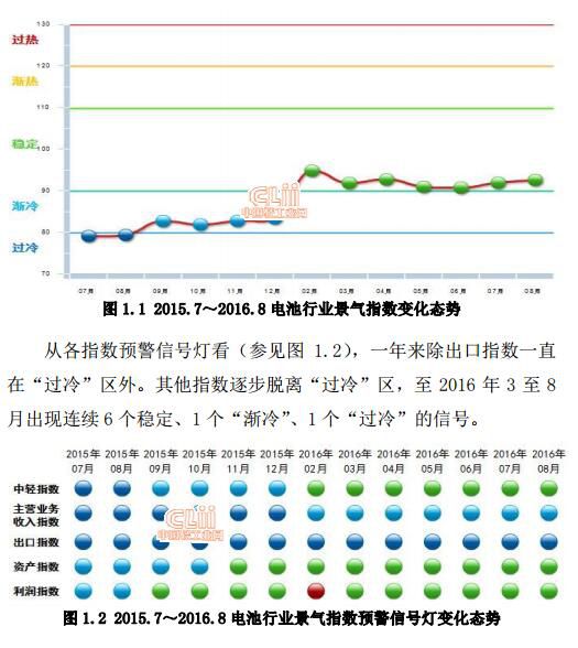 1、中轻电池景气指数分月走势2015年3月至8月中轻电池景气指数连续6个月在“过冷”区运行,9月至12月在“渐冷”区运行,2016年2月起在电池利润、资产指数增长的影响下,中轻电池景气指数上升至“稳定”区。2016年8月中轻电池景气指数为92.59 ,与7月91.94相比上涨0.65个百分点
