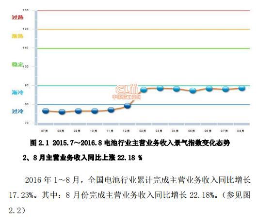 1、电池主营业务收入景气指数“过冷”2014年10月至2015年12月,电池主营业务收入景气指数一直在“过冷”提示区运行,2016年2月起连续7月在“渐冷”提示区。 延伸阅读:2016年1-7月电池行业主营业务收入情况分析