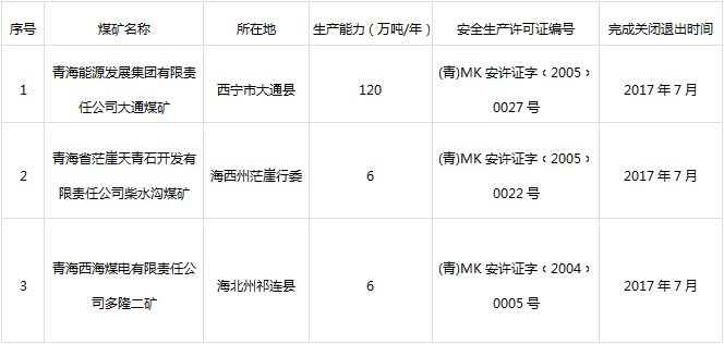 橙电网电力网获悉,近日青海省发改委发布了关于2017年青海省煤炭行业化解过剩产能目标任务完成情况的公告,详情如下:关于2017年青海省煤炭行业化解过剩产能目标任务完成情况的公告根据《国务院关于煤炭行业化解过剩产能实现脱困发展的意见》(国发〔2016〕7号)和《青海省人民政府办公厅关于印发青海省钢铁、煤炭行业化解过剩产能实施方案的通知》(青政办〔2016〕173号)精神,现将2017年青海省煤炭行业化解过剩产能产能目标任务完成情况公告如下:2017年全省煤炭行业化解过剩产能目标任务为:关闭青海能源发展集团有