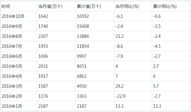 前瞻产业研究院数据显示,2016年10月全国铅酸蓄电池出口量为1642万个,同比下降6.1%。1-10月累计出口量为16592万个,同比下降6.6%