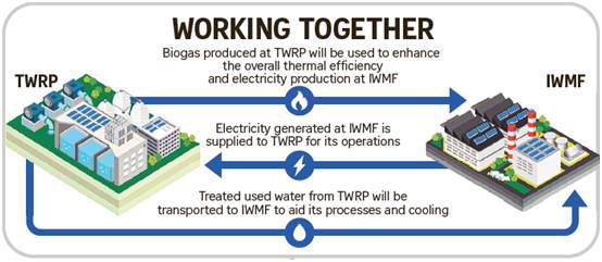 新加坡的水务机构PUB和国家环境局NEA合作推出一项颇具环境创造力的环保工程规划,使再生水厂(Tuas Water Reclamation Plant  –TWRP)和垃圾处理厂(Integrated Waste Management Facility  -IWMF)协同合作,实现水-能源-废弃物的循环。IWMF和TWRP将在各自的固体废弃物处理和污水处理过程中最大限度地实现能源和资源回收