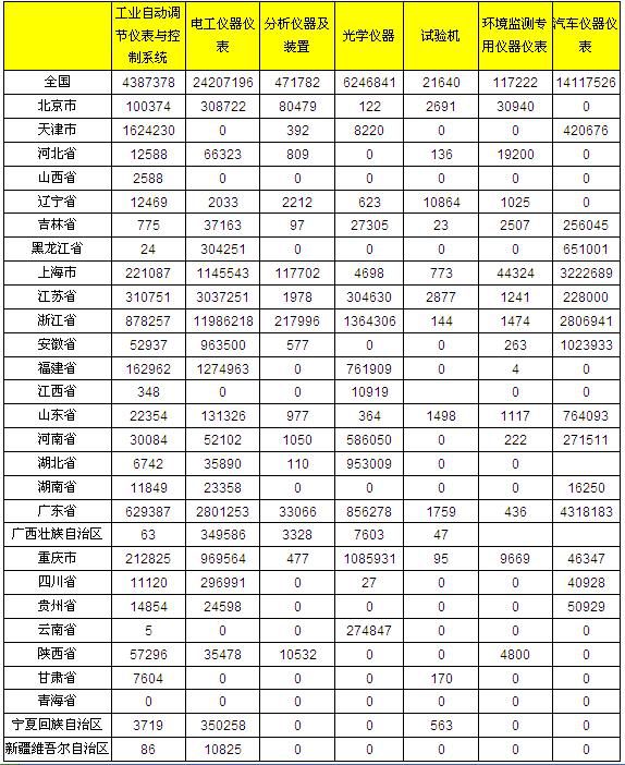 上海仪器仪表行业协会发布2012年1-3月仪器仪表主要子行业各地产量比较,第一季度,全国生产工业自动化调节仪表与控制系统4387378台,电工仪器仪表24207196台,环境监测专用仪器仪表117222套。