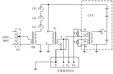 TY-调压控制箱;TB-激励变压器;P0-标准电压互感器;Y1,Y2-电压负荷箱;CVT-被试电容式电压互感器
