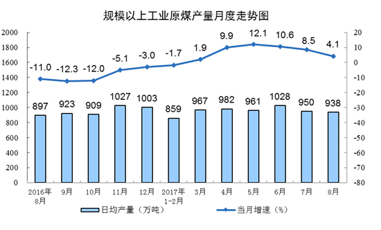 8月份,规模以上工业能源生产总体平稳,煤油气电涨跌各异。其中,原煤产量增速有所放缓,原油生产降幅略有扩大,原油加工量增速明显回升,天然气生产持续快速增长,电力生产增速回落