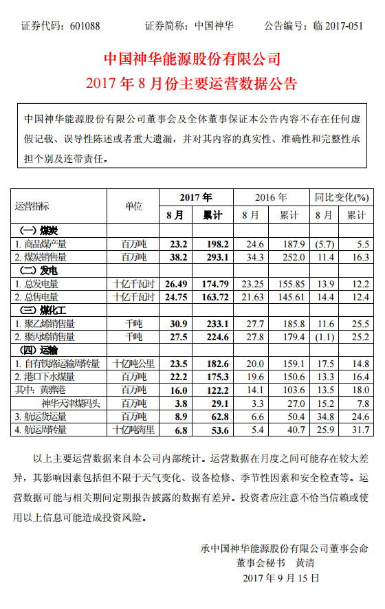 中国神华近日发布的2017年8月份主要运营数据公告显示,8月份,中国神华发电量264.9亿千瓦时,同比增长13.9%。2017年1-8月份,累计发电量1747.9亿千瓦时,同比增长12.2%