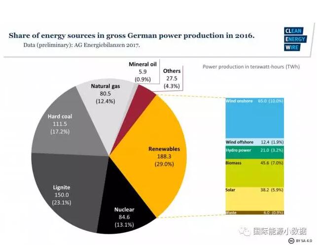 2016年,德国的发电量中有29.0%来自可再生能源(风电11.9%、生物质7.0%、太阳能5.9%、水电3.2%、垃圾0.9%),创历史新高。但是,煤电依然占总发电量的40.3%,天然气发电占13.1%、核电各占12.4%