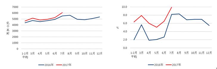 1-7月份,全国电力供需总体宽松。全社会用电量增速同比提高,7月当月用电量创历史新高;工业用电较快增长,轻、重工业用电增速同比提高;四大高载能行业用电均实现正增长,合计用电增速低于工业;发电装机增速较上年回落,水电当月发电量正增长;发电设备利用小时与上年基本持平,水电利用小时同比降低;全国跨区、跨省送出电量同比增长;新增火电装机同比降低,新增太阳能发电装机同比大幅提高