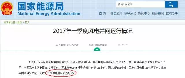 昨天,国家能源局发布了2017年第一季度的风电并网运行情况:“1-3月,全国风电上网电量687亿千瓦时,同比增长26%;平均利用小时数468小时,同比增加46小时;弃风电量135亿千瓦时,比去年同期减少57亿千瓦时,弃风限电情况明显好转。” (来源:微信公众号“能源大嘴” ID:goodenergy 作者:孟琦) 来自国家能源局官网截图 弃风限电情况真的有“明显好转”